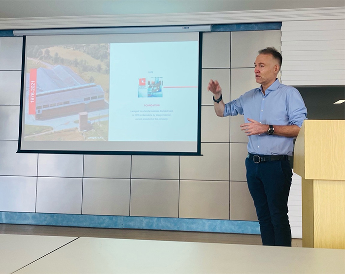 Sebastian, Giám đốc kinh doanh từ LAMIGRAF đã đến thăm chúng tôi và chia sẻ một báo cáo trong BODA. Ông đã giới thiệu cơ bản về lịch sử phát triển của LAMIGRAF. Một số thiết kế phổ biến, trường hợp ứng dụng thực tế và xu hướng màu sắc của năm tới.